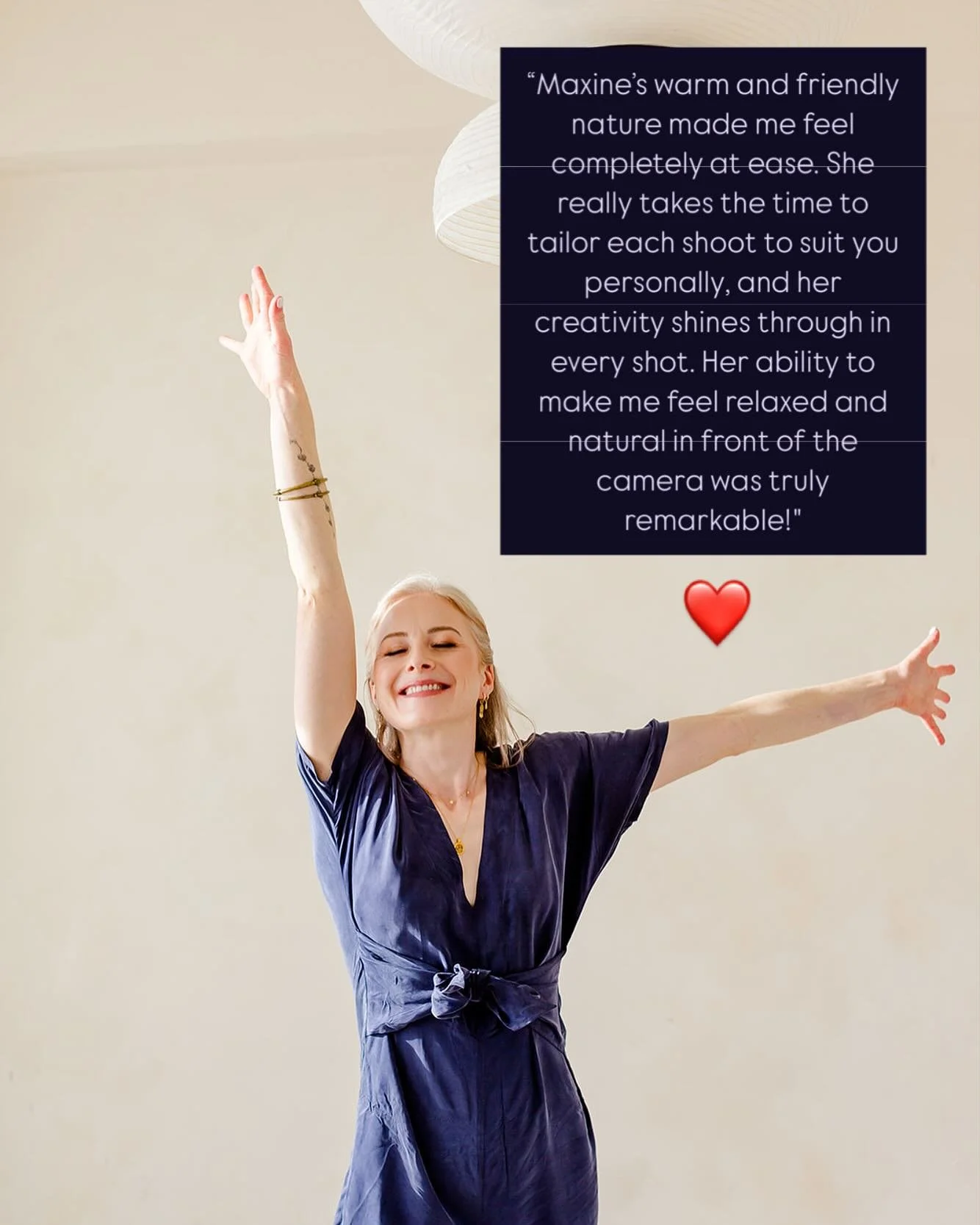 “Maxine is both professional and friendly. Her intake questions and checklist made it easy for me to prepare for the photoshoot. Although being in front of a camera is out of my comfort zone, Maxine made me feel comfortable, and I had a lot of fun. She’s a joy to work with!”